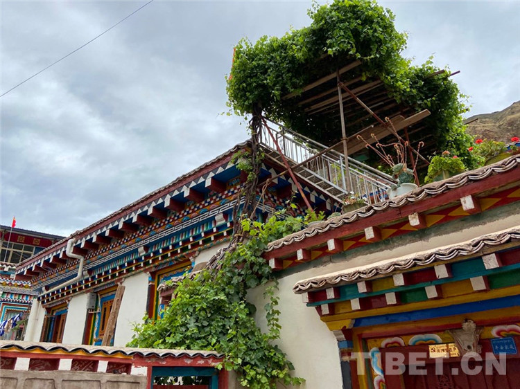 與同行者贊嘆一番,我的目光緩緩下移。在葡萄架側(cè)下方的房頂上,擺放著一排花盆。眾人皆知藏族愛花,即使在冬季,居民也會(huì)在陽(yáng)臺(tái)養(yǎng)著幾盆花。如今進(jìn)入雨季,主人把一盆盆花兒搬上房頂,與遠(yuǎn)方的朋友共享好時(shí)光。