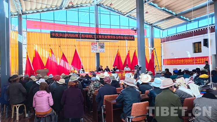 圖為西藏自治區(qū)日喀則市南木林縣卡孜鄉(xiāng)山洪溝治理工程項(xiàng)目民工工資發(fā)放暨勞務(wù)合作社分紅儀式現(xiàn)場(chǎng)