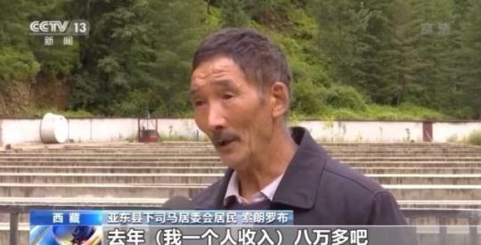 亞?wèn)|縣下司馬居委會(huì)居民 索朗羅布:去年(我一個(gè)人收入)八萬(wàn)多,魚(yú)塘里面工資也有,國(guó)家邊境補(bǔ)貼也有,生活可以的,沒(méi)事(問(wèn)題)的。