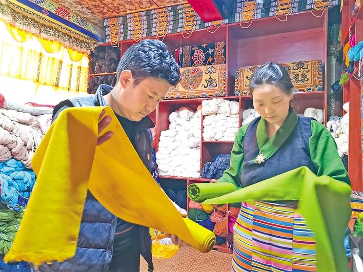 日喀則市仁布縣德吉林鎮(zhèn)德旦康薩傳統(tǒng)手工業(yè)農(nóng)牧民專業(yè)合作社負(fù)責(zé)人旦真正在查看產(chǎn)品質(zhì)量。記者 扎西頓珠 攝
