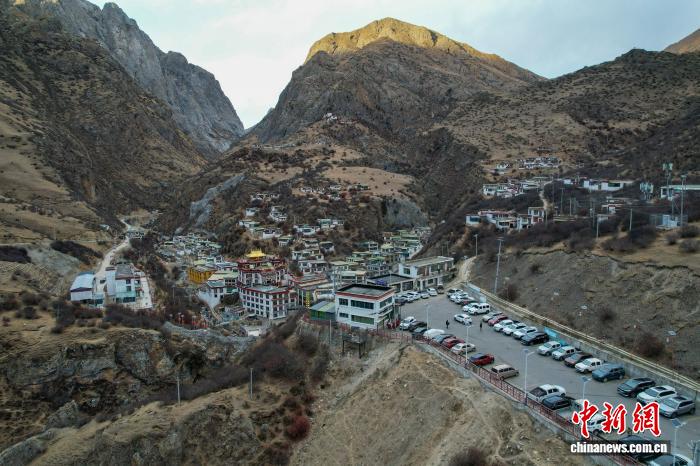 1月2日傍晚,拉薩市墨竹工卡縣德仲溫泉附近的停車場(chǎng)幾乎停滿了車輛。(無(wú)人機(jī)畫(huà)面)中新社記者 江飛波 攝