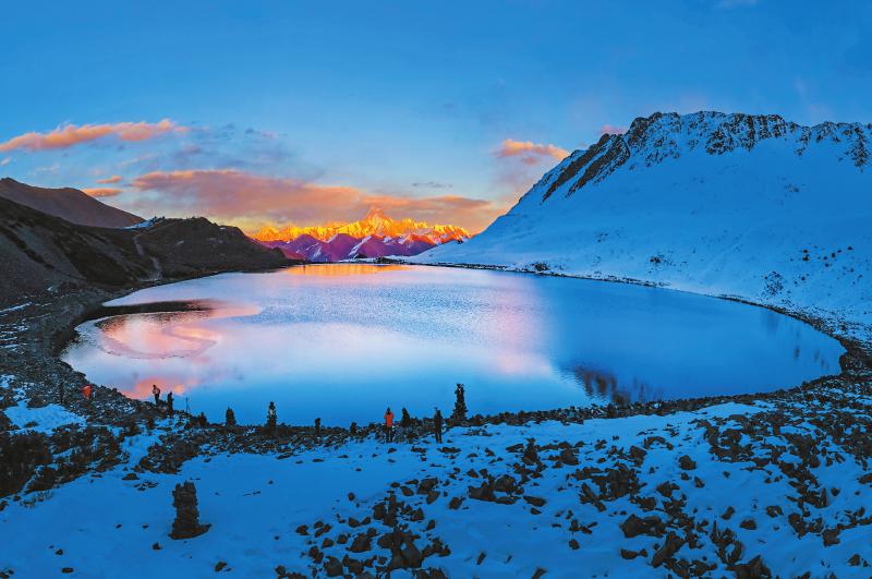 游客在康定市沙德鎮(zhèn)觀德結湖觀賞日照金山。本組圖片由 鄒麗君 攝