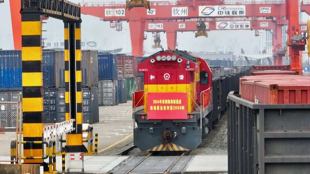 3月17日上午,一列滿載緬甸黑芝麻、海南椰子汁、廣西白糖等貨物的海鐵聯(lián)運(yùn)班列,從欽州鐵路集裝箱中心站緩緩發(fā)出駛向四川城廂站。這是2024年西部陸海新通道開行的第2000列海鐵聯(lián)運(yùn)班列,同比增長(zhǎng)16.8%,提前14天完成一季度班列開行任務(wù)。