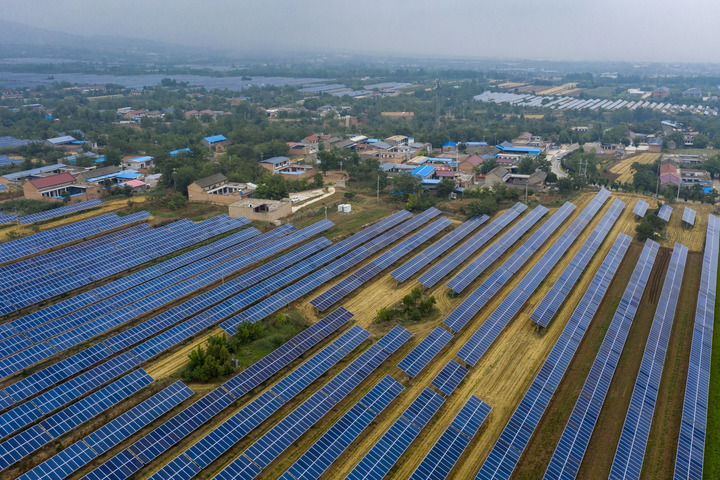 2025年6月25日在山西省運(yùn)城市芮城縣夭上村拍攝的光伏基地(無人機(jī)照片)。新華社記者 楊晨光 攝