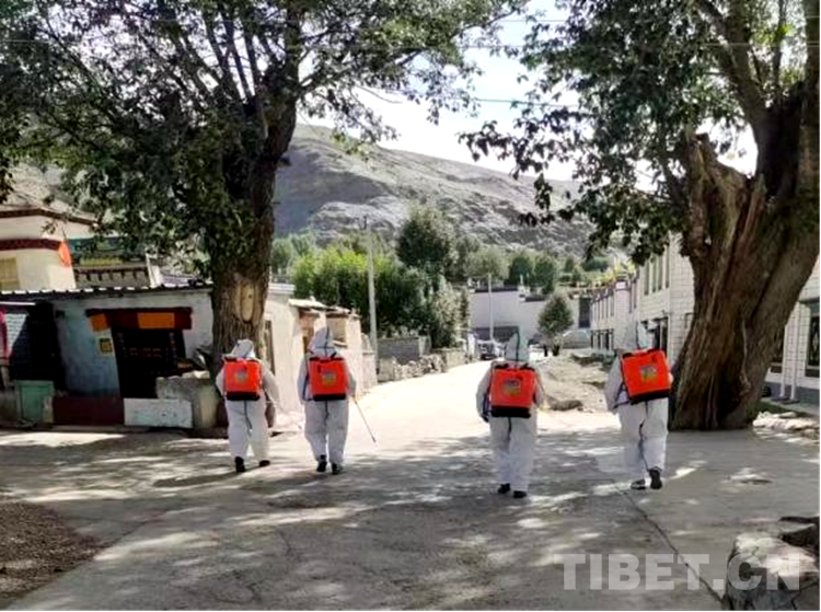 圖為志愿服務(wù)隊(duì)志愿者們在拉隆村進(jìn)行消毒工作