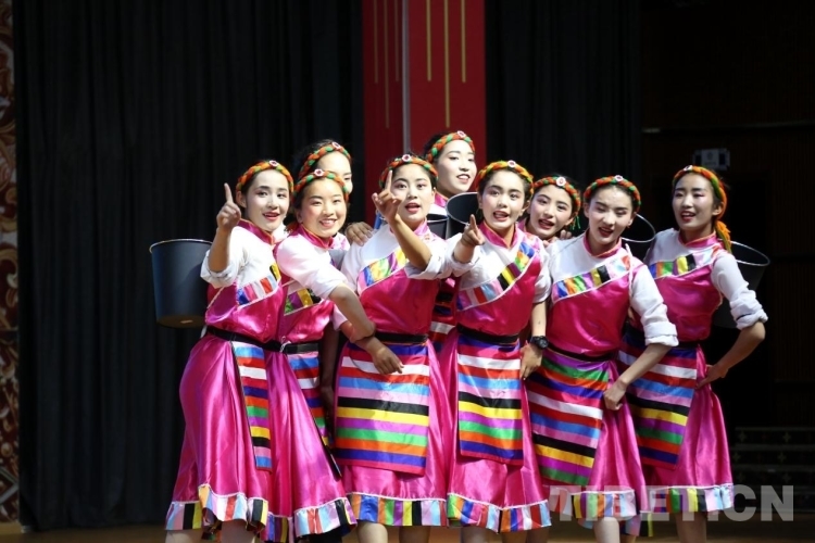 圖為拉薩那曲第二高級(jí)中學(xué)的學(xué)生們?cè)谖乃嚤荣愔斜硌莨?jié)目 攝影:王佳豪
