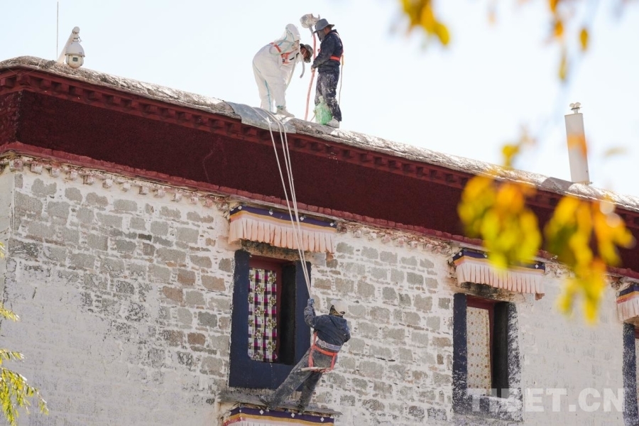 圖為專(zhuān)業(yè)工人正在為布達(dá)拉宮外墻噴涂涂料 攝影:邊子捷