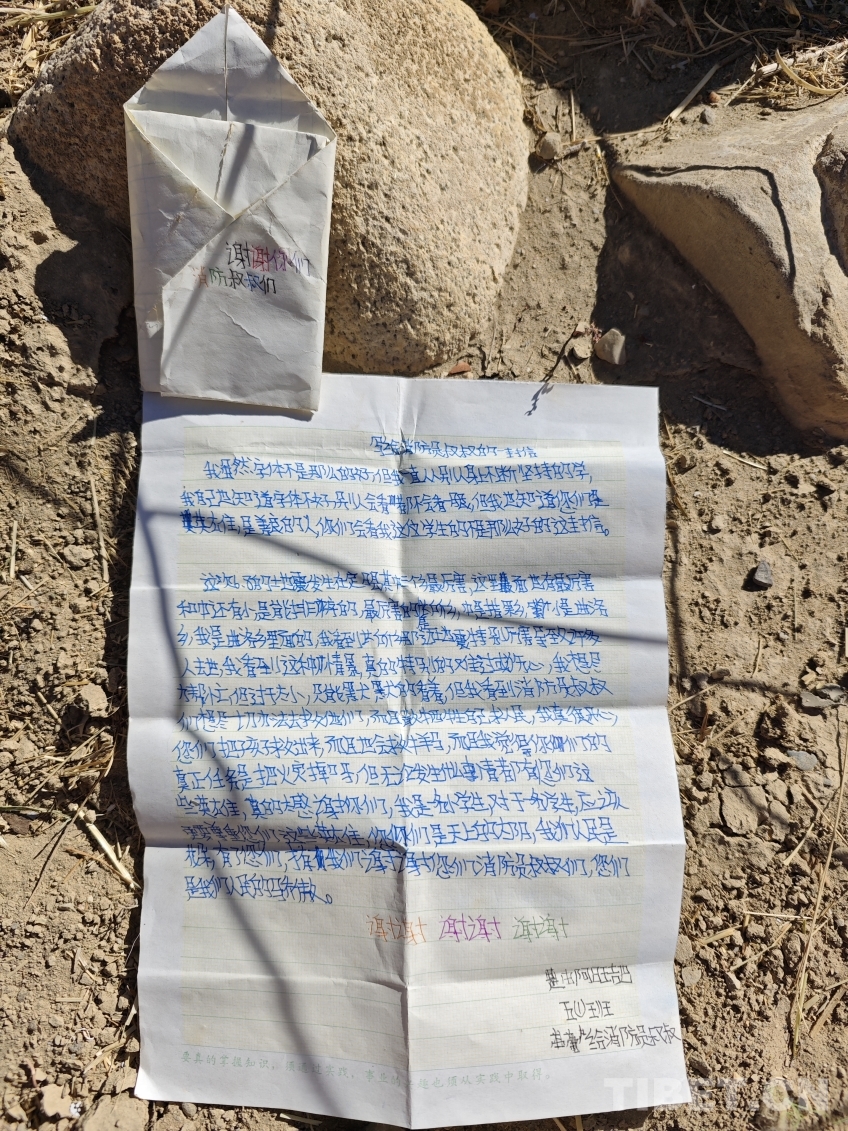 阿旺吉巴在信中寫到:“我雖然字不是那么好看,但我一直從別人身上堅持的學……我看到這種情景真的特別難過,我想盡力幫忙,但是過于太小……但我看到消防員叔叔們想盡一切辦法救他們……你們把孩子救出來,而且也會救牛羊馬……我是一名小學生,對于一名學生應該要尊重您們這些英雄,您們是天上的太陽,我們人民是花朵,有了您們,才有我們,謝謝您們消防員叔叔們,您們是我們人民的驕傲?!?/p>