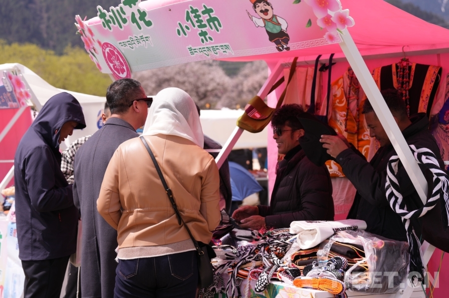 沿著蜿蜒的小路,一邊是錯(cuò)落有致的桃花樹,一邊是特色集市?!斑@些是工布男女服飾、這是馬套、這是藏式包包……都是我們合作社的工作人員手工制作的?!痹谖枧_(tái)一旁的桃花小集市,林芝市巴宜區(qū)絲綢藏裝定制農(nóng)牧民專業(yè)合作社負(fù)責(zé)人尼瑪扎西正向游客一一介紹自家展銷點(diǎn)的產(chǎn)品以及其背后的文化和制作過程。經(jīng)過一番討價(jià)還價(jià),一千余元的“大單子”順利成交,游客將一件件精美的巴宜“小禮品”裝進(jìn)袋子和尼瑪扎西揮手告別。