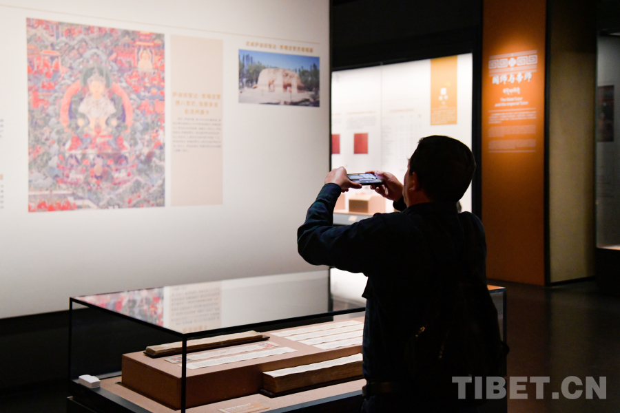 圖為西藏博物館內(nèi)游客認(rèn)真觀看佛教藝術(shù)相關(guān)展陳 攝影:趙振宇
