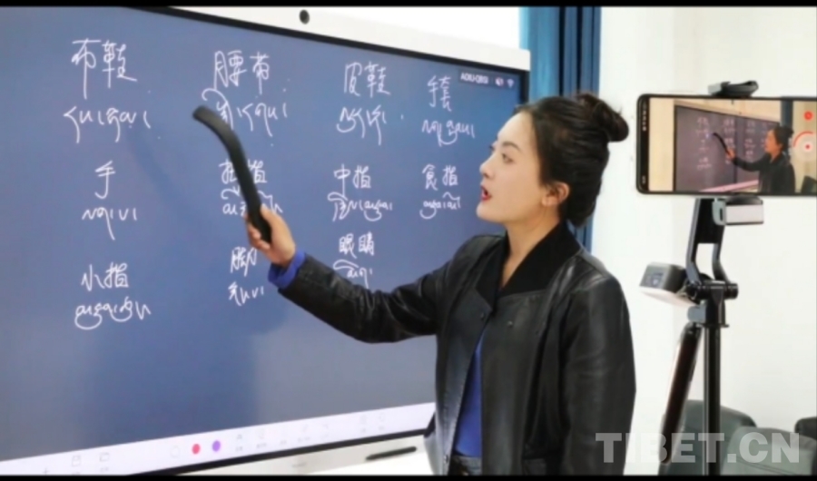 圖為次仁嘎措在給當(dāng)?shù)啬撩窠套R(shí)字 受訪者供圖