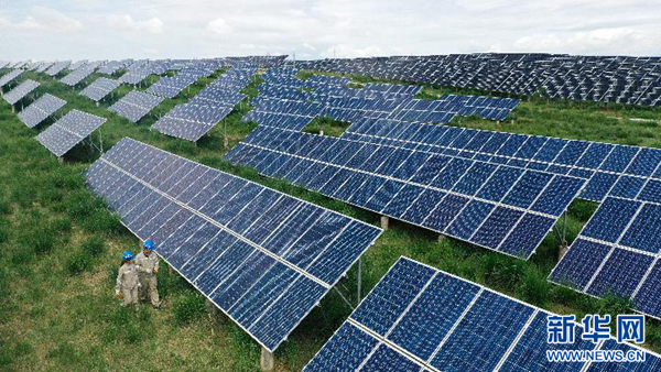 7月8日,在青海省海南藏族自治州共和縣,大唐青海公司新能源分公司兩名工作人員在光伏電站內(nèi)巡檢(無人機(jī)照片)。新華社記者 張宏祥 攝