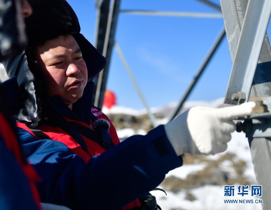 1月21日,國家電網(wǎng)西寧供電公司輸電運檢中心運檢人員在查看線路覆冰情況。新華社記者 張龍 攝