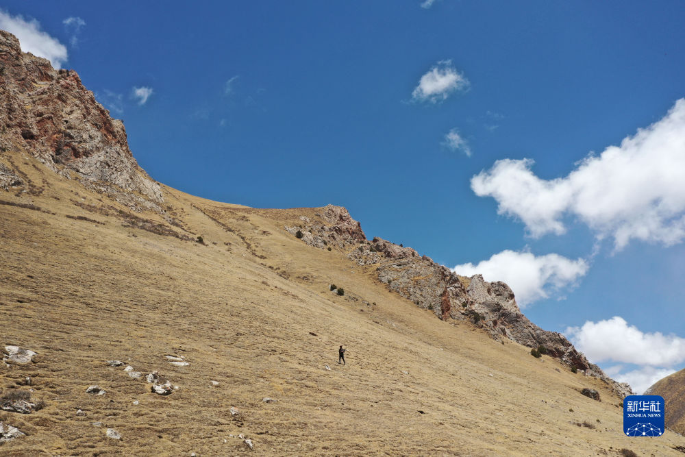 4月22日,生態(tài)管護員達杰在巡山(無人機照片)。新華社記者 韓方方 攝