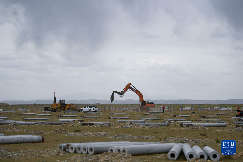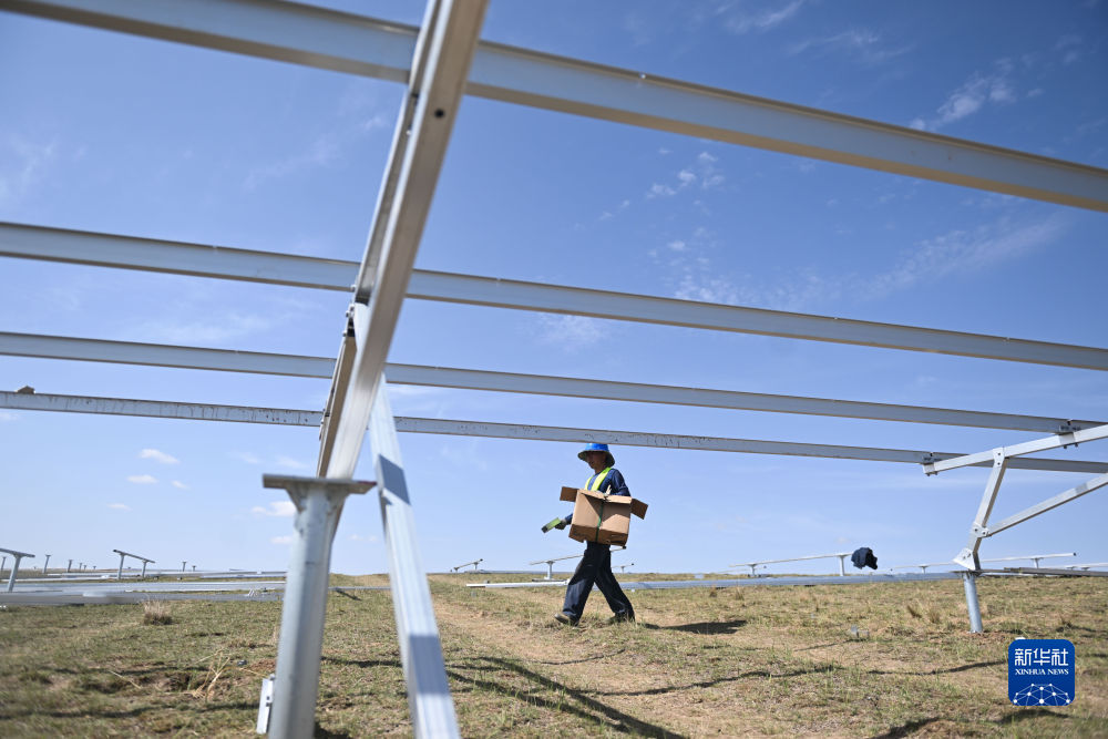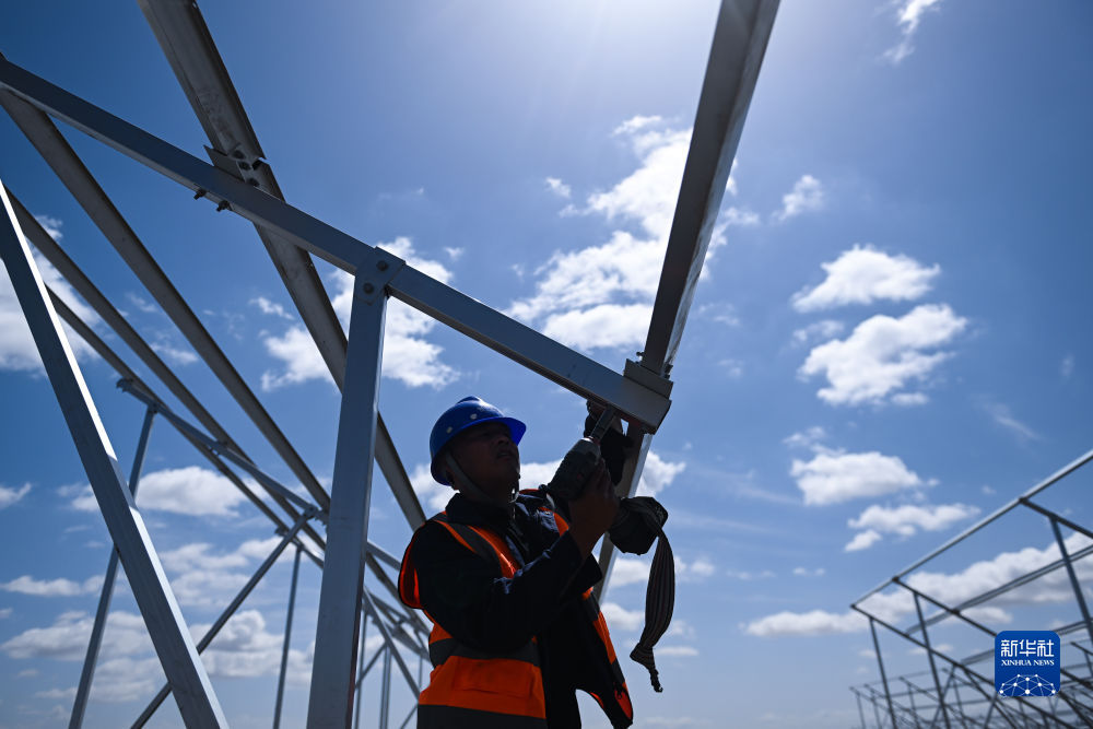 6月8日,工人在國家能源集團海南基地共和縣100萬千瓦牧光儲二期20萬千瓦建設項目施工。新華社記者 張龍 攝