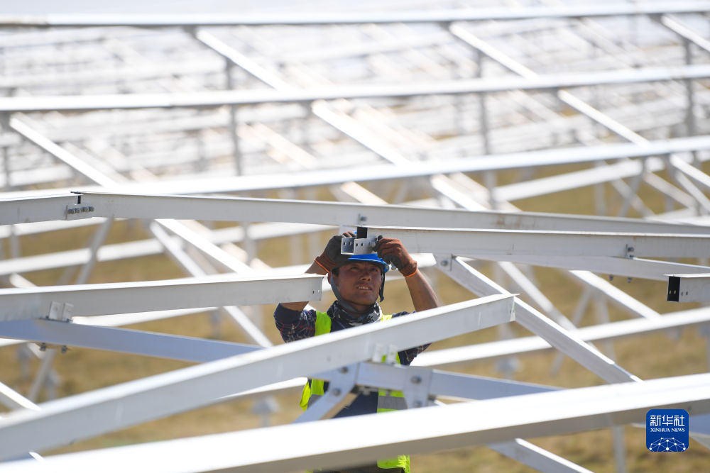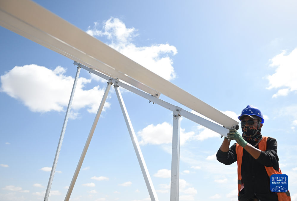 6月8日,工人在黃河上游水電開發(fā)有限責任公司海南基地共和縣100萬千瓦光伏項目施工。新華社記者 周盛盛 攝
