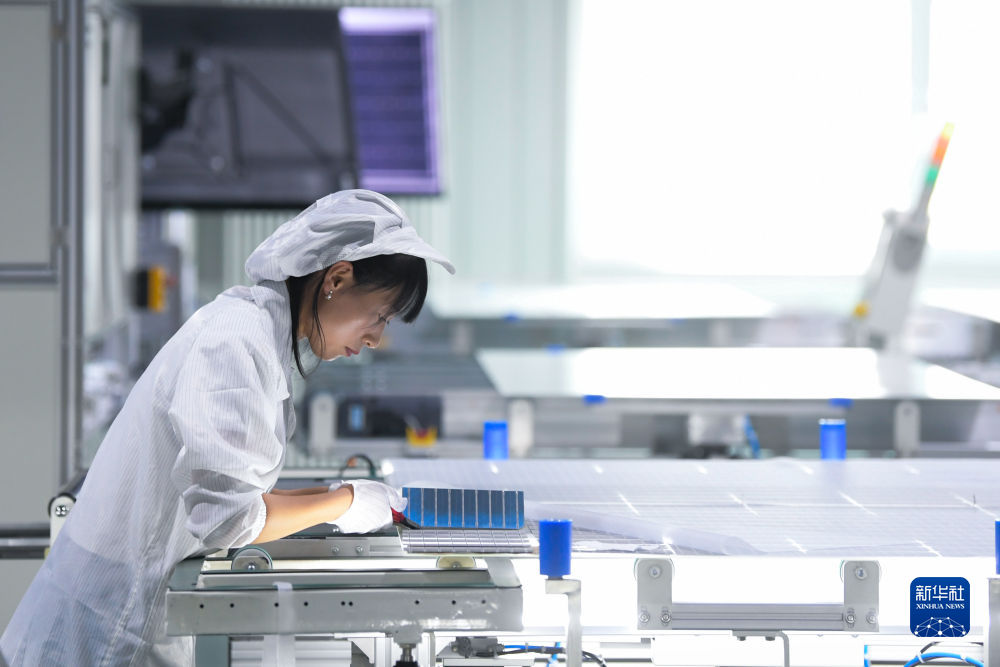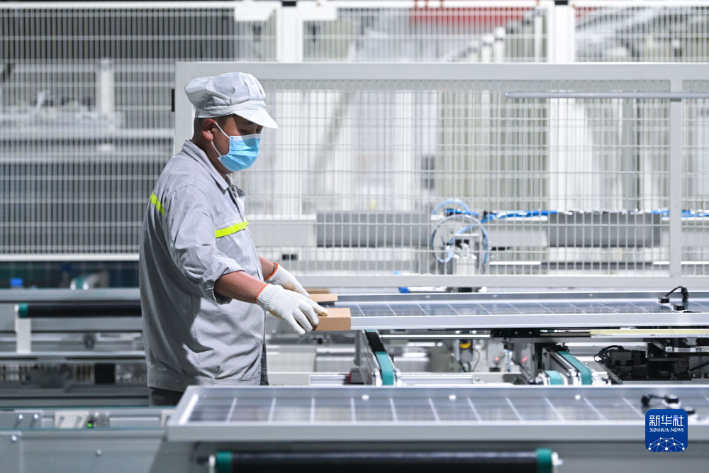 6月7日,青海隆基樂葉光伏科技有限公司工人在廠區(qū)加工光伏組件。新華社記者 周盛盛 攝