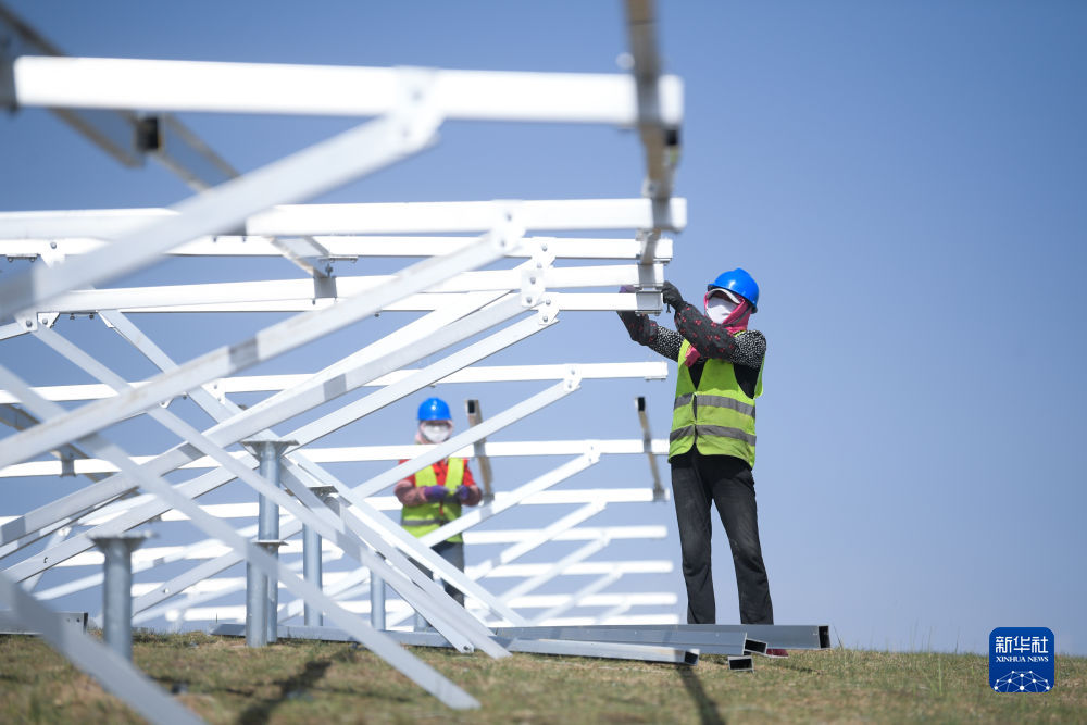 6月8日,工人在黃河上游水電開發(fā)有限責任公司海南基地共和縣100萬千瓦光伏項目施工。新華社記者 張龍 攝