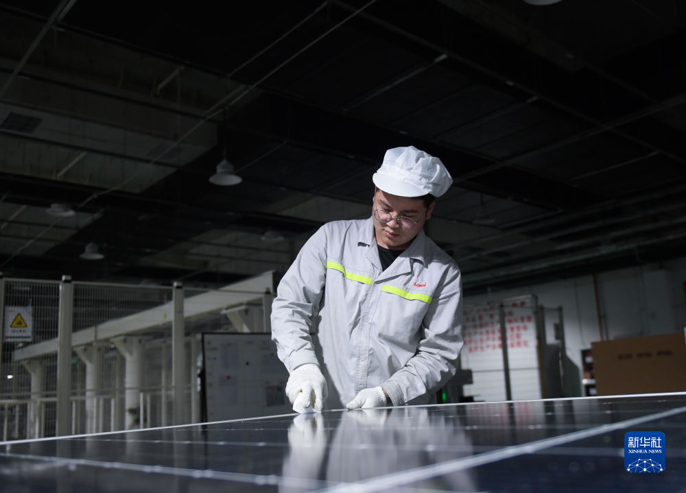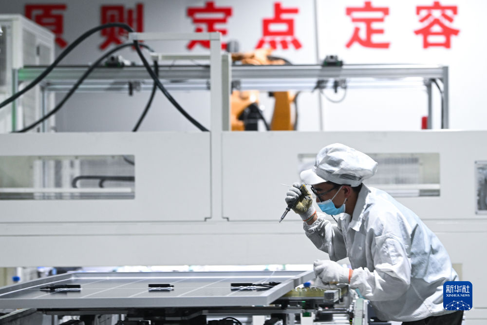 6月7日,青海隆基樂葉光伏科技有限公司工人在工廠內檢查光伏組件。新華社記者 張龍 攝