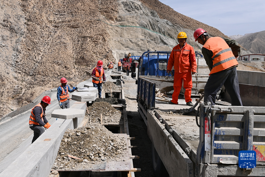 6月8日,在蓄集峽水利樞紐工程現(xiàn)場,施工人員進行大壩后預制塊鋪裝作業(yè)。新華社記者 范培珅 攝