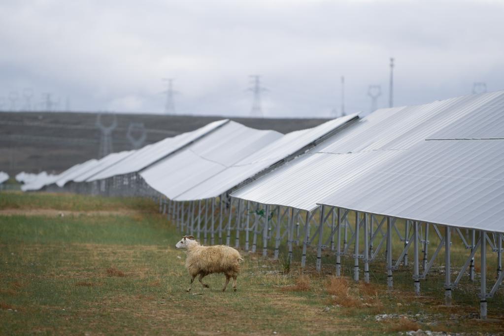 青海省海南藏族自治州,綿延數百平方公里的塔拉灘生態(tài)光伏發(fā)電園區(qū)里,深藍色的“光伏海洋”蔚為壯觀,光伏板下牧草茂盛,綠意盎然。