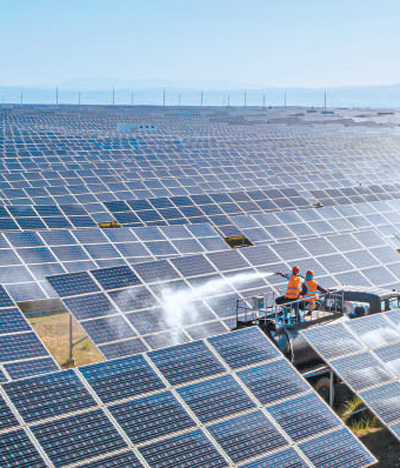 光伏產業(yè)園區(qū)內,工人在清洗光伏板。