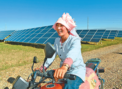 落日余暉中,牧民索南卓瑪騎著一輛摩托車,沿著歸家的方向,緩緩跟在羊群后面?!白詮难b了光伏板,生態(tài)治理同步發(fā)力,一些戈壁灘變成了綠地,我們的生活也越來越好了?!睂ρ矍巴恋匕l(fā)生的變化,生于斯長于斯的索南卓瑪深有感觸。