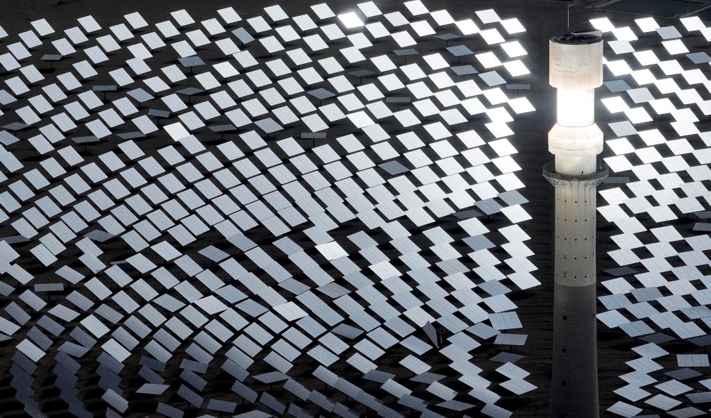 蔚藍色的光伏板在陽光照射下熠熠生輝,光能便轉(zhuǎn)化成源源不斷的電能;風(fēng)力發(fā)電機的葉片迎風(fēng)飛轉(zhuǎn),風(fēng)被“捕捉”進一條條輸電線;百米高的吸熱塔和“鏡子海洋”組成熔鹽塔式光熱電站,科技感與綠色減碳有機結(jié)合……