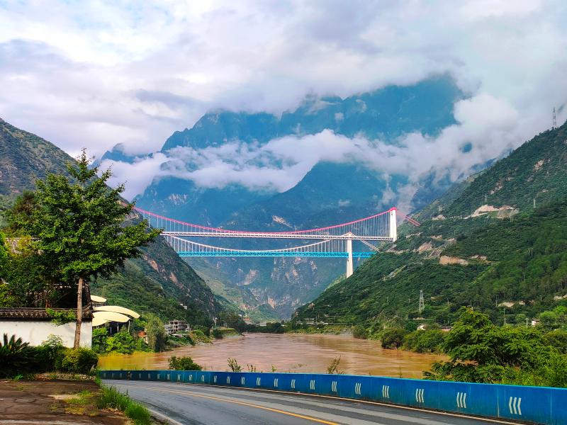 麗香鐵路、香麗高速、國道214虎跳峽段“三路“同框 (李競?cè)?攝)