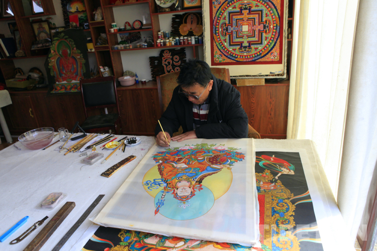 科考隊(duì)對(duì)玉科鎮(zhèn)的歷史街巷、傳統(tǒng)民居,進(jìn)行了系統(tǒng)的勘測(cè)和記錄。并對(duì)玉科鄉(xiāng)村遺產(chǎn)中活態(tài)延續(xù)的非物質(zhì)文化技藝與人居環(huán)境的共生關(guān)系,進(jìn)行了系統(tǒng)的走訪調(diào)研。在返鄉(xiāng)畫(huà)師、州級(jí)非物質(zhì)文化傳承人呷瓦家中,科考隊(duì)看到了繪制在絲絹上的唐卡。呷瓦早先曾在北京游藝,深受當(dāng)?shù)匚幕绊?,后因家鄉(xiāng)的鄉(xiāng)村文旅發(fā)展火熱,就帶著滿心的故土鄉(xiāng)愁回到家鄉(xiāng)授徒創(chuàng)業(yè)。在家鄉(xiāng),呷瓦把藏族傳統(tǒng)唐卡繪畫(huà)與中國(guó)傳統(tǒng)的水墨畫(huà)相融合,首創(chuàng)了這樣創(chuàng)新的畫(huà)法。