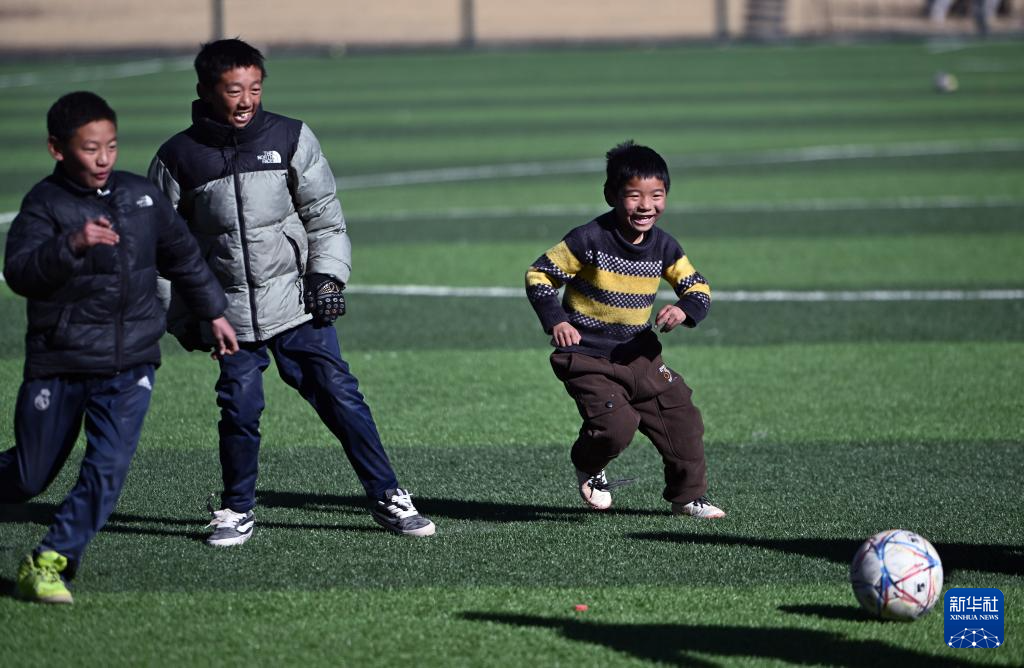 青海玉樹曲麻萊縣葉格鄉(xiāng)寄宿制小學(xué)學(xué)生卓瑪加(右)和伙伴們在球場踢球(1月12日攝)。新華社記者 韓方方 攝