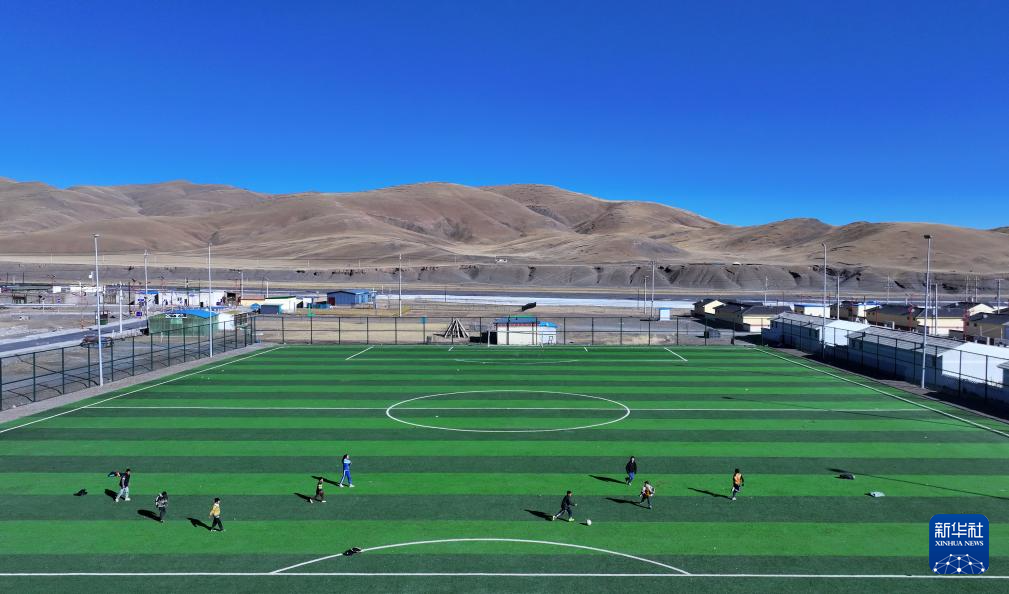1月12日,孩子們在青海玉樹曲麻萊縣葉格鄉(xiāng)足球場上踢球(無人機(jī)照片)。新華社記者 韓方方 攝