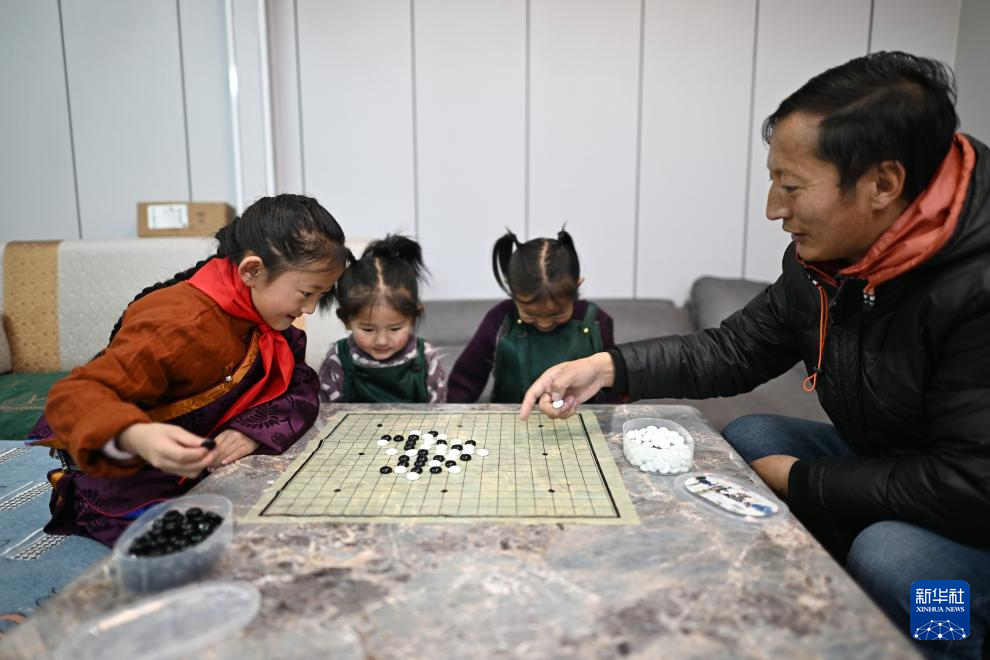 青海玉樹曲麻萊縣第二民族完全小學(xué)學(xué)生達(dá)沙旦增德金(左一)在家中和爸爸一起下五子棋(1月12日攝)。新華社記者 張宏祥 攝