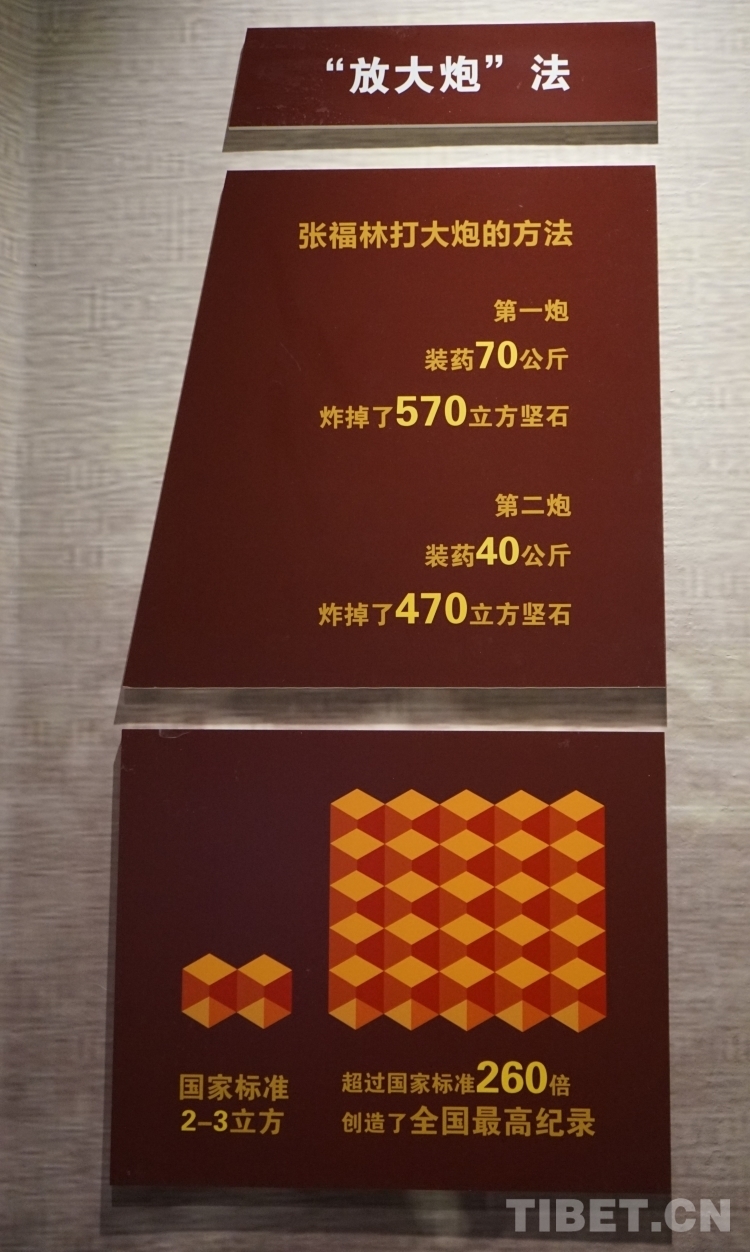 在雀兒山修路時(shí),張福林白天與戰(zhàn)友們懸在巖壁上打炮眼,晚上到工地上研究堅(jiān)石、孤石、松石、片石等各種石頭的打眼、裝藥、放炮等技術(shù),并積極向工程人員、技工同志、工兵部隊(duì)學(xué)習(xí),最終提出了改進(jìn)裝藥的方法,即“放大炮法”?!胺糯笈诜ā钡谋乒πС瑖?guó)家標(biāo)準(zhǔn)260倍,創(chuàng)造了全國(guó)爆破的最高紀(jì)錄。這一方法不僅能提高工效,還能節(jié)約炸藥,在筑路部隊(duì)中得到全線推廣,張福林也被大家譽(yù)為“大炮手”。