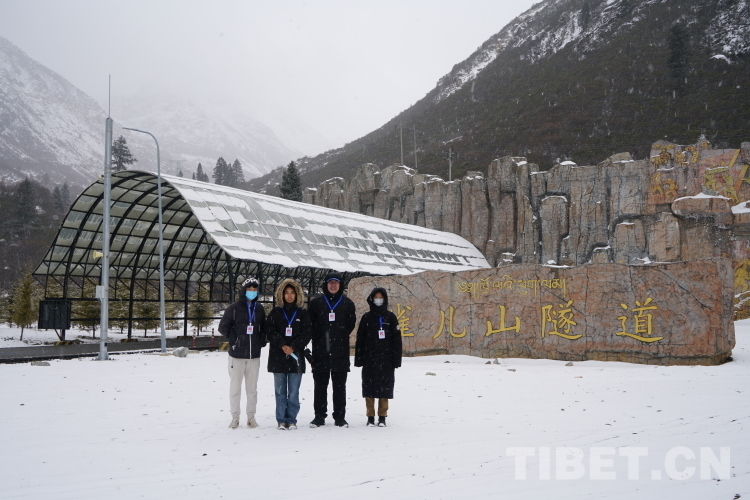 圖為川藏線采訪隊(duì)記者在雪中的雀兒山隧道口合影留念 攝影:達(dá)瓦次仁