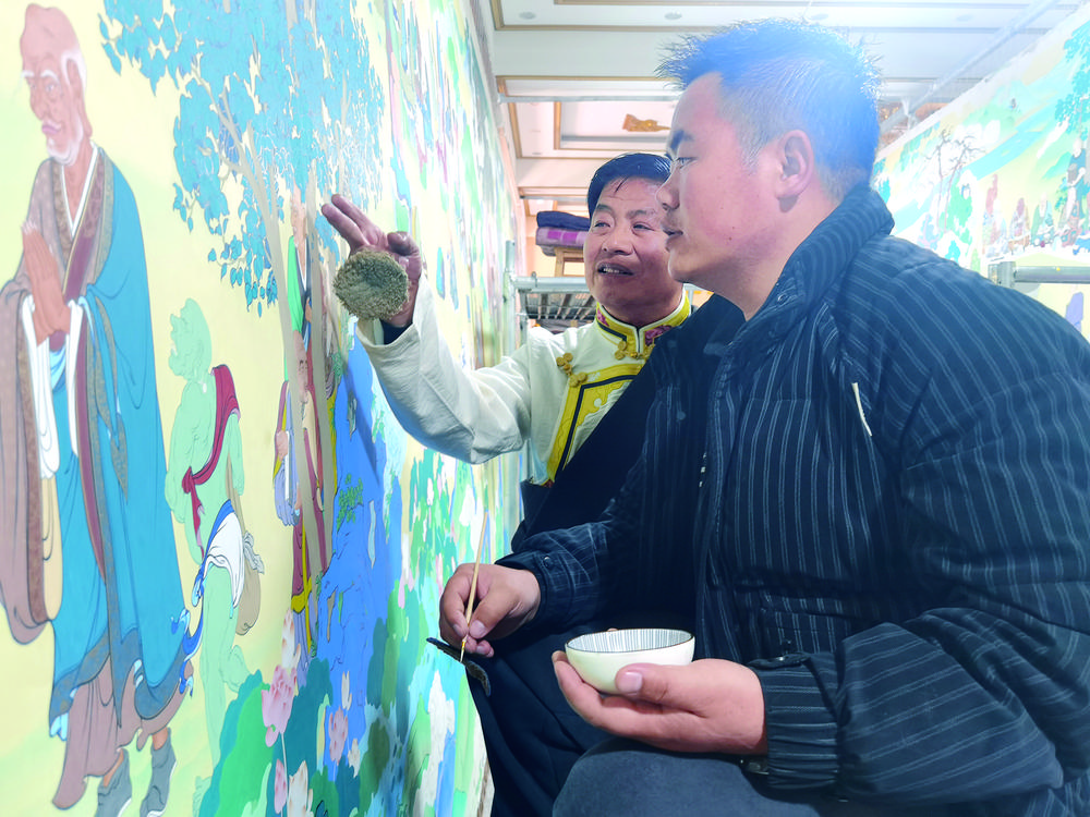 “小范,朱砂顏色有點(diǎn)厚,碗里再加點(diǎn)水,顏料稠度要合適,這樣顏料不易從畫(huà)布上剝落……”扎西尖措耐心地指導(dǎo)徒弟范慶基。每天,扎西尖措都會(huì)來(lái)畫(huà)室轉(zhuǎn)轉(zhuǎn),為徒弟指出繪畫(huà)、上色等方面的不足之處,幫助他們更快進(jìn)步。