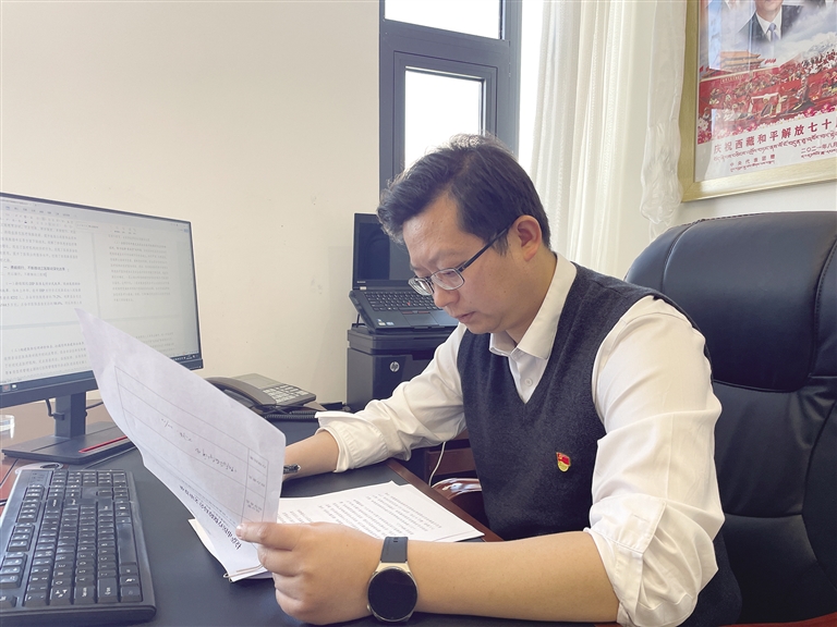 周夕鳴正在閱讀相關(guān)工作文件。