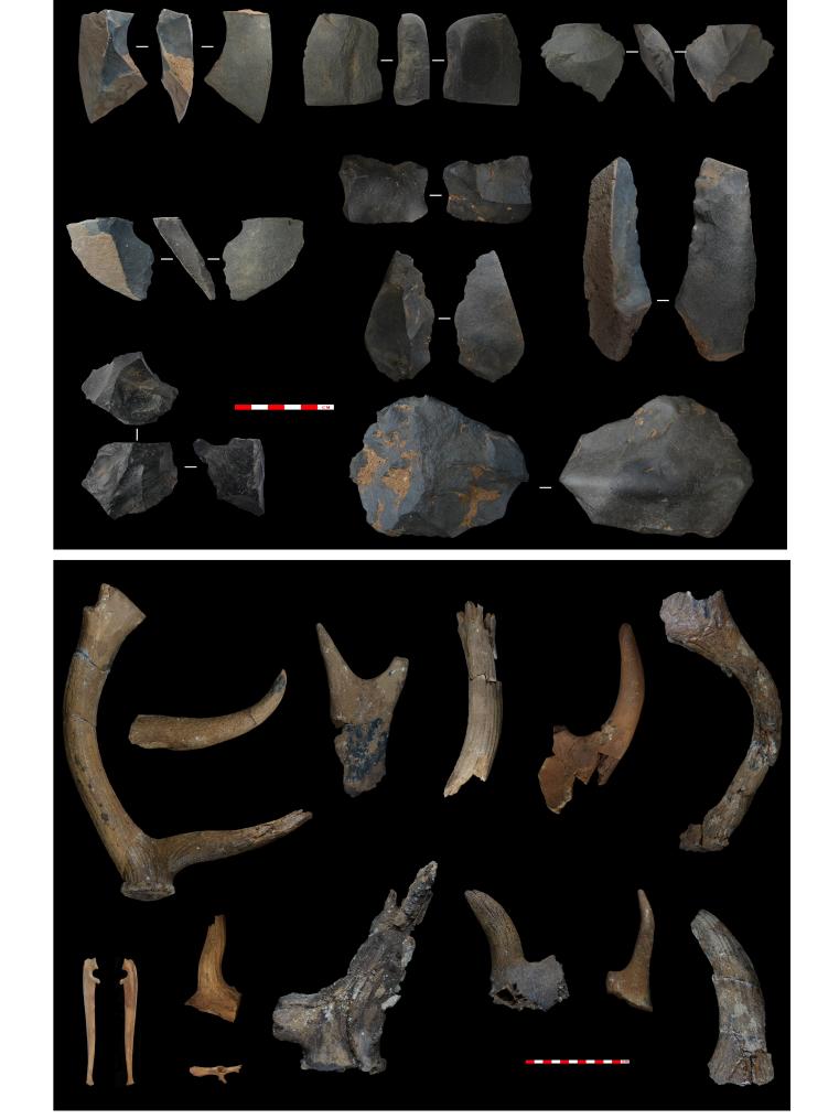 第一期遺存——石制品(上);第一期遺存——動物化石(下)。(資料圖片由中國科學院古脊椎動物與古人類研究所提供)