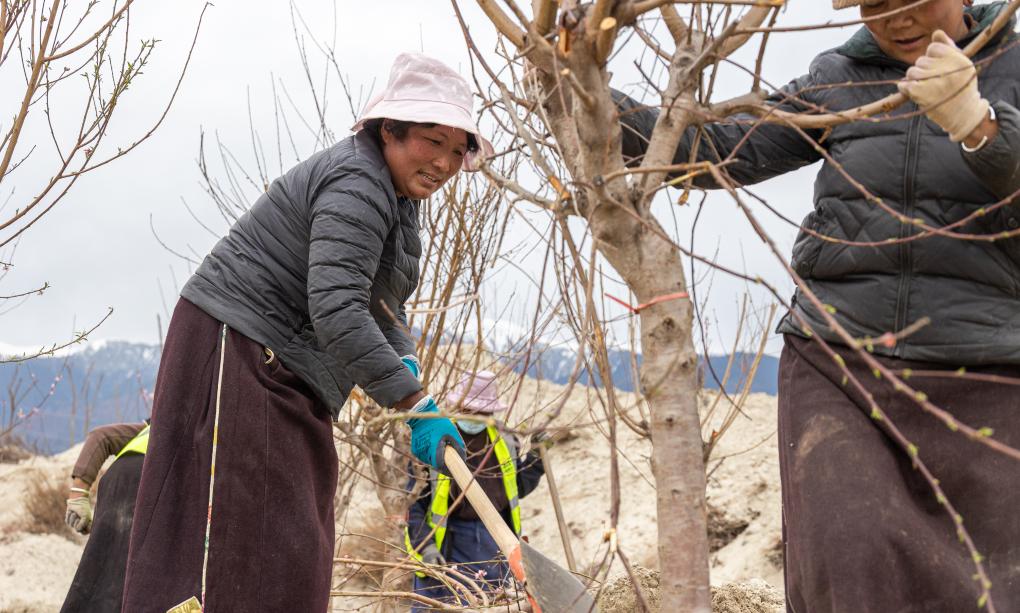 “這里以后也會(huì)成為桃花園!”56歲的嘎拉村村民尼瑪曲吉說(shuō)。在嘎拉村外尼洋河的河灘上,她和村民們正在種桃樹(shù),挖坑、正苗、培土,累了就唱幾句藏歌。聽(tīng)到記者叫了一聲“阿佳”(藏語(yǔ)大姐之意),尼瑪曲吉熱情招手。