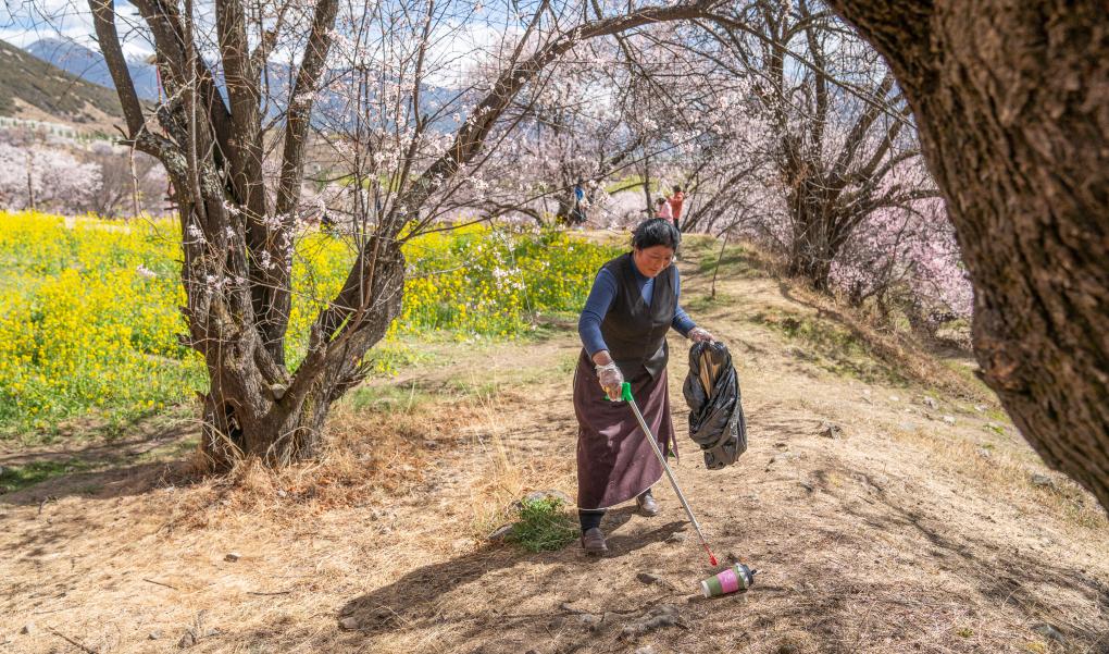尼瑪曲吉在嘎拉村桃花園里撿拾垃圾(4月1日攝)。新華社記者 丁增尼達(dá) 攝