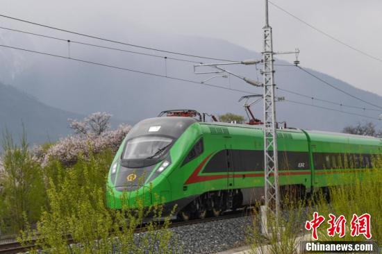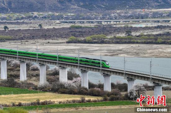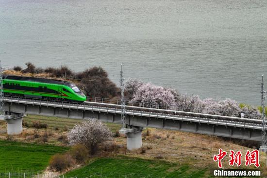 復興號動車組不僅是一種便捷的交通方式,更成為了一種獨特的旅游體驗,讓游客能夠近距離欣賞到西藏林芝春季獨特的自然美景。圖為穿梭在桃花林中的拉林鐵路高原復興號。