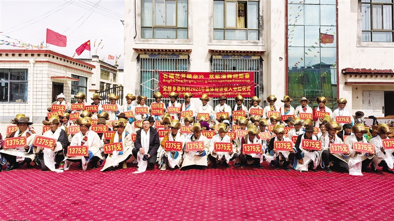 “羅薩扎西德勒!這是您家的分紅款!”定結(jié)鄉(xiāng)黨委副書記、鄉(xiāng)長高文雄為75歲的村民央金遞上分紅紅包并表達(dá)自己的祝福。長桌上,“卡賽”、青稞酒擺成“豐收塔”;長桌旁,8.8萬元分紅款化作“新年紅包”,村民們揣著紅包看表演,共同分享村集體經(jīng)濟(jì)發(fā)展的豐碩成果,藏歷新年的喜慶與鄉(xiāng)村振興的碩果在此刻交融。