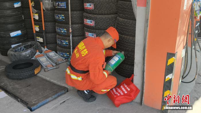 圖為消防隊員正在仔細(xì)檢查店內(nèi)消防器材是否完好有效。林芝市森林消防支隊供圖