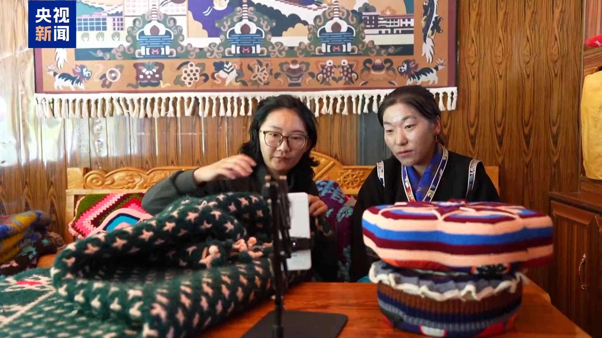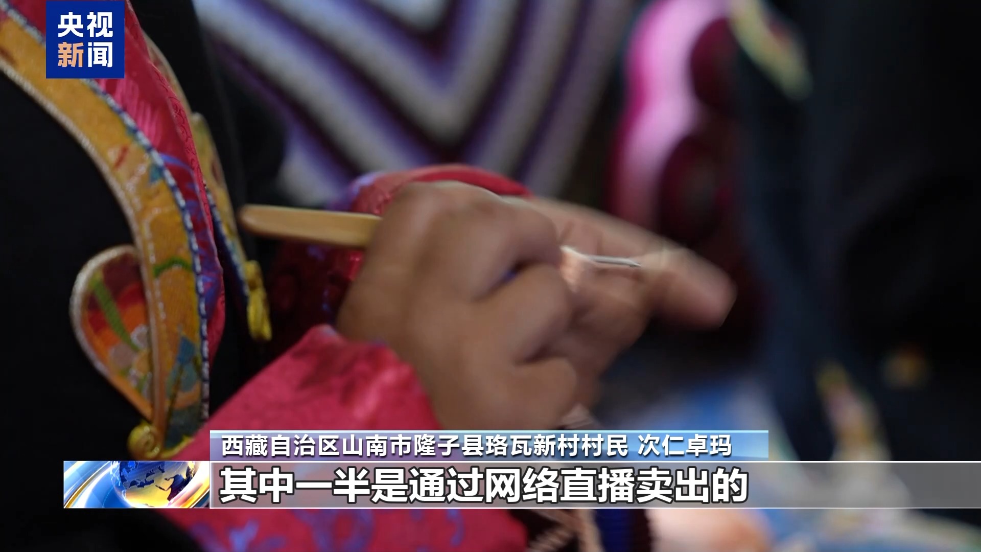 西藏自治區(qū)山南市隆子縣珞瓦新村村民 次仁卓瑪:今年以來,我們已經(jīng)賣出了50多條毛毯,100多個(gè)靠枕,其中一半是通過網(wǎng)絡(luò)直播賣出的。