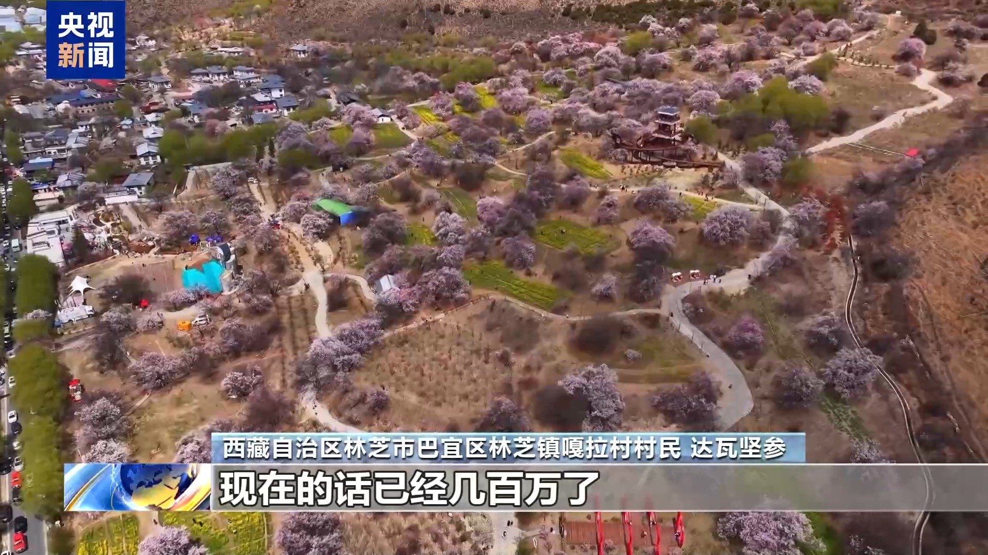 西藏自治區(qū)林芝市巴宜區(qū)林芝鎮(zhèn)嘎拉村村民 達(dá)瓦堅(jiān)參:以前從桃花節(jié)開始搞起來的時(shí)候,全村收入幾百塊錢到幾千塊錢到幾萬(wàn)塊錢,現(xiàn)在的話已經(jīng)幾百萬(wàn)了。