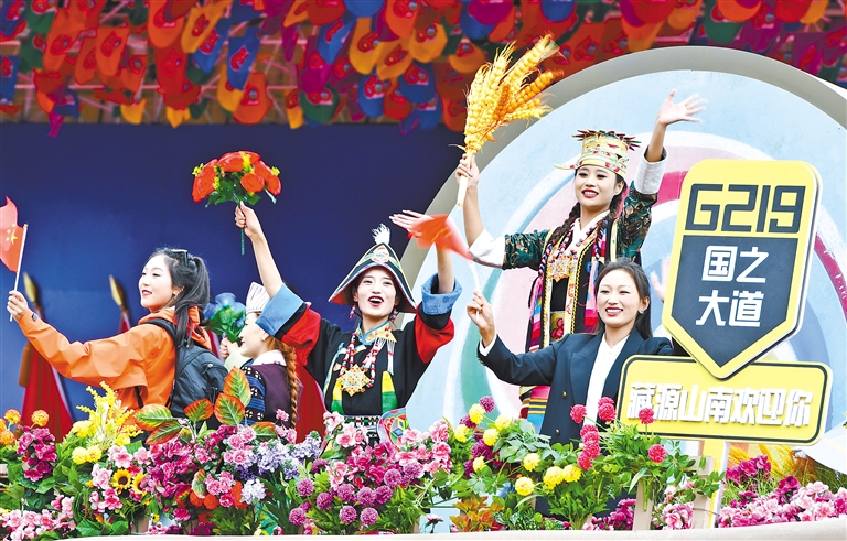 “藏源山南”彩車上的演員通過布達(dá)拉宮廣場(chǎng)時(shí)向人群揮手。