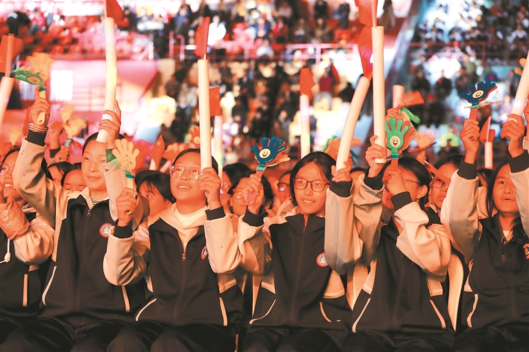 閉幕式公益演出現(xiàn)場熱情洋溢的學(xué)生們。