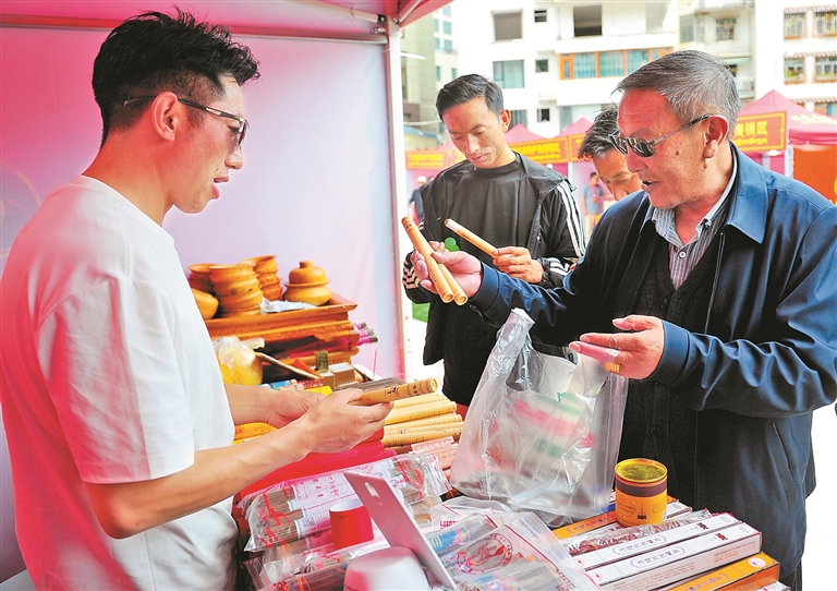 特色產(chǎn)品展銷柜臺,市民正在選購洛隆藏香。