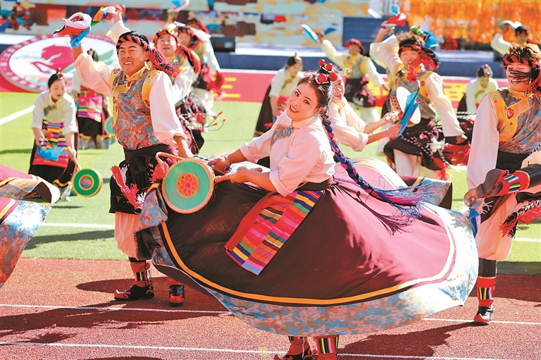9月15日舉行的第十一屆三江茶馬文化藝術(shù)節(jié)開幕式上,來自昌都11個(gè)縣(區(qū))的群眾代表組成游行方隊(duì),載歌載舞,繞場一周,熱烈激昂的丁青熱巴、豪邁威武的類烏齊嶺卓舞、優(yōu)美歡快的芒康弦子等非遺舞蹈,向現(xiàn)場的干部群眾和各界來賓展示了昌都獨(dú)特的傳統(tǒng)文化和熱情好客的真摯情誼。隨后的文藝表演以歌舞和情景劇的形式,從金沙江的紅色記憶,到怒江的文化傳承,再到瀾滄江的高質(zhì)量發(fā)展之光,描摹出了昌都?xì)v史文化的主要脈絡(luò)和經(jīng)濟(jì)社會發(fā)展取得的巨大成就,為現(xiàn)場觀眾奉獻(xiàn)了一場難忘的文藝盛宴。
