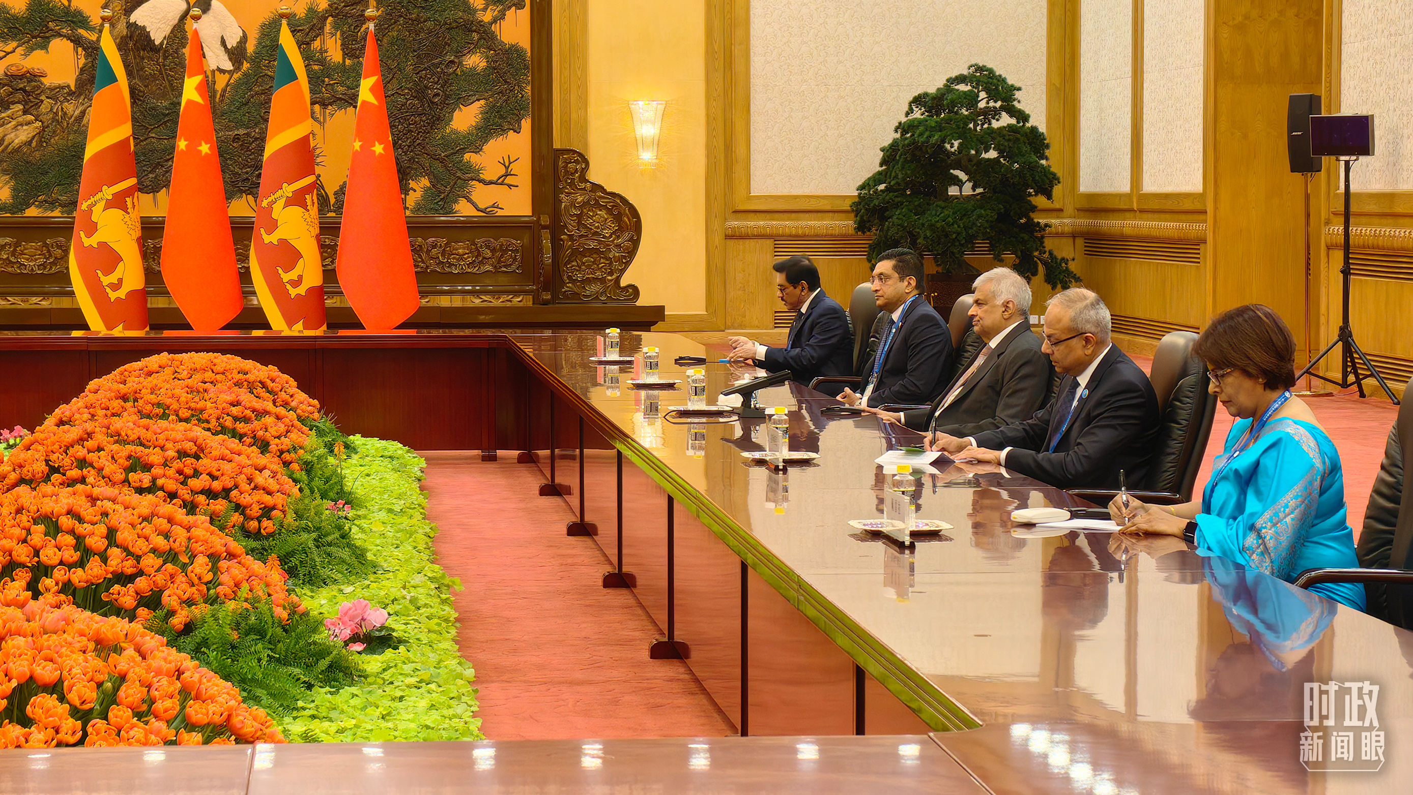 會見現(xiàn)場擺放的中國、斯里蘭卡國旗。(總臺央視記者范一鳴拍攝)